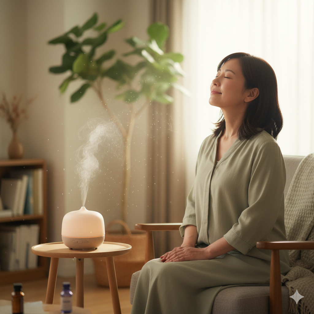 ラベンダーやベルガモットなど、心地よい香りのアロマをディフューザーで焚き、目を閉じて深く呼吸する時間を持ちましょう。