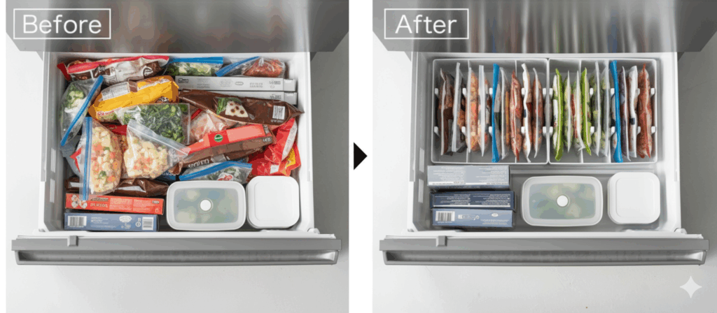 4. 冷凍室:「立てる&ラベリング」で探し物ゼロ!ストック管理術