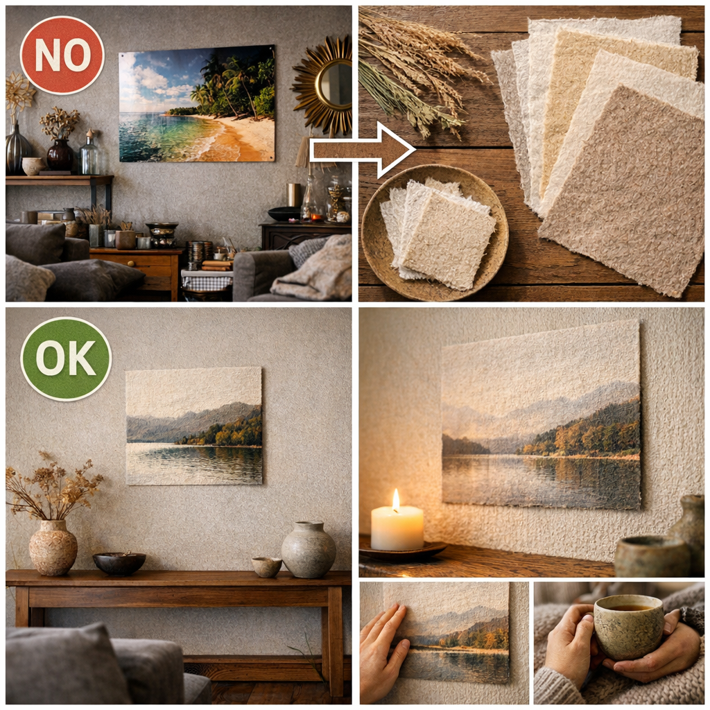 例えば、繊維に奥行きがある天然素材(和紙など)に仕立てられた写真は、どんな照明の下でもテカることがありません。まるで最初からそこにあったかのように壁に馴染み、空間に静かな「体温」を宿してくれます。これこそが、大人の女性が選ぶべき、引き算のディスプレイ術です。